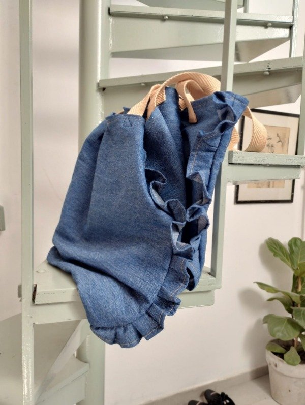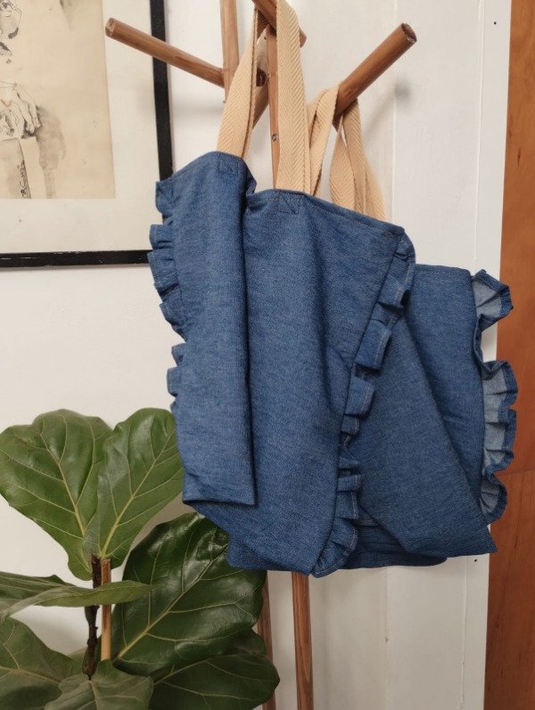 bolsa de tela tusor o jean con volados a ambos lados. consulta colores en stock
